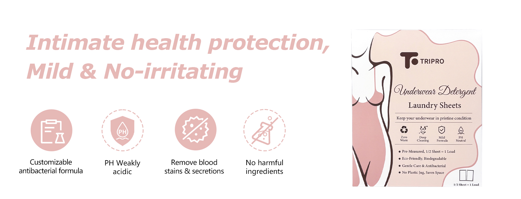 Advantages: TRIPRO Laundry Sheet For Female Underwear breaks the situation accurately! With four core competitiveness including no harmful additives, weak acid pH value, efficient decomposition of blood stains and secretions, and customizable antibacterial formula, it builds a differentiated product matrix, accurately matching the modern women's demand for healthy lingerie washing.